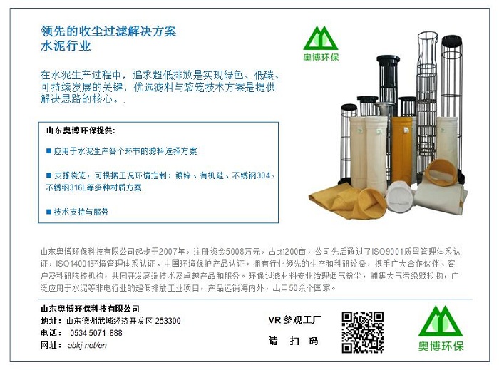 山東奧博環(huán)保公司提供的技術(shù)文章“水泥行業(yè)濾袋和袋籠選用指南”引起了國(guó)內(nèi)外水泥行業(yè)的關(guān)注,成功入選英國(guó)《國(guó)際水泥評(píng)論》雜志第10期,這是《國(guó)際水泥評(píng)論》本期期刊中唯一在列的中國(guó)技術(shù)文章。全球水泥行業(yè)最具權(quán)威性的主流媒體的肯定,意味著山東奧博環(huán)保的提供濾袋與袋籠技術(shù)進(jìn)入新的高度,引領(lǐng)水泥收塵行業(yè)的過(guò)濾技術(shù)發(fā)展。
