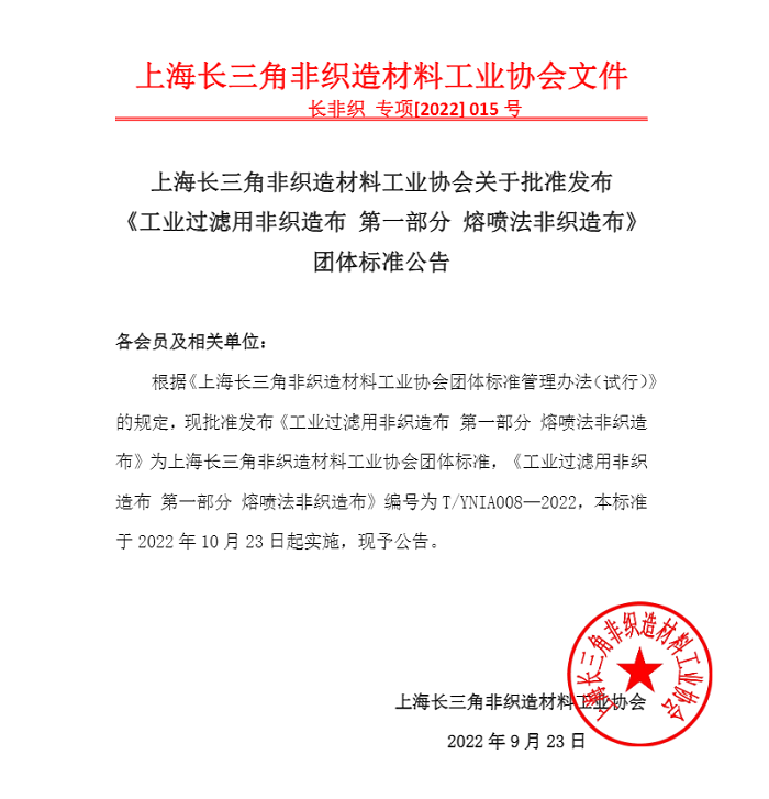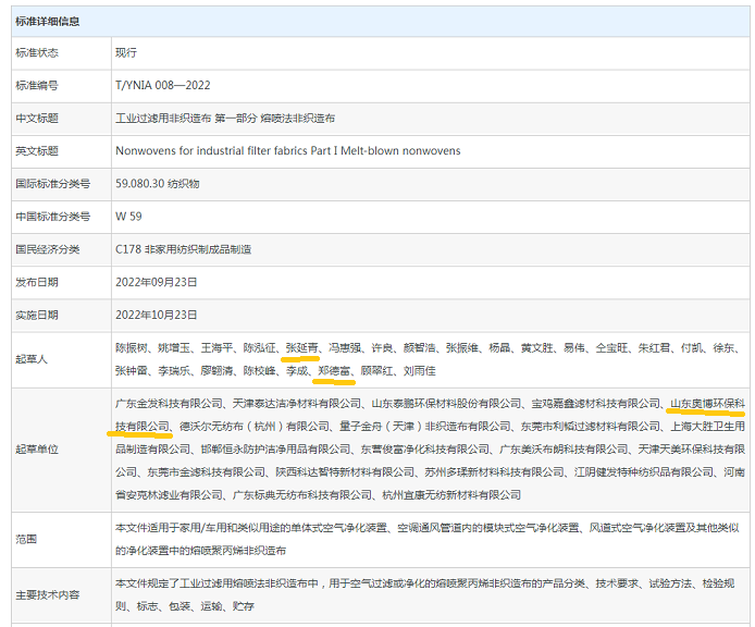 2022年9月23日,山東奧博環(huán)??萍加邢薰緟⑴c編制的 T/TNIA 008-2022《工業(yè)過濾用非織造布 第一部分 熔噴法非織造布》由上海長三角非織造材料工業(yè)協(xié)會權(quán)威發(fā)布,并于2022年10月23日起實施。